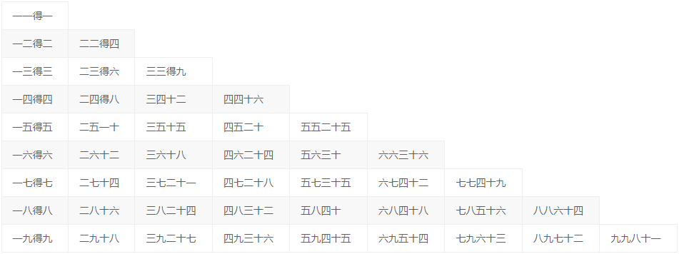 一九得九 二九十八 三九二十七 四九三十六 五九四十五 六九五十四 七九六十三 八九七十二 九九八十一